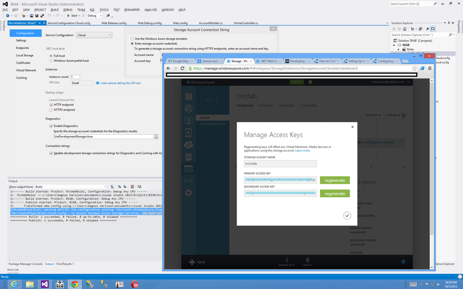 Right click the web role under roles in solution manager and choose properties. Choose "Service configuration: Cloud". At "specify storage account credentials" we will copy/paste our account name and key from the Azure management platform.
