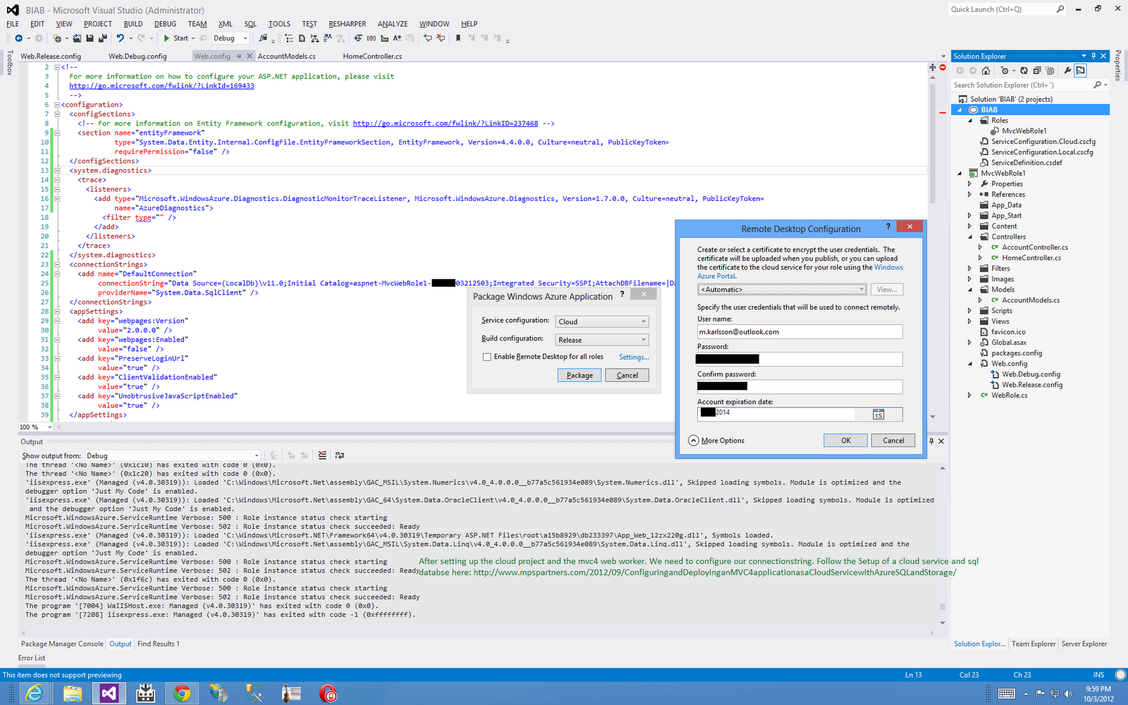 Setup and configure a MVC4 project for Cloud Service(web role) and SQL Azure